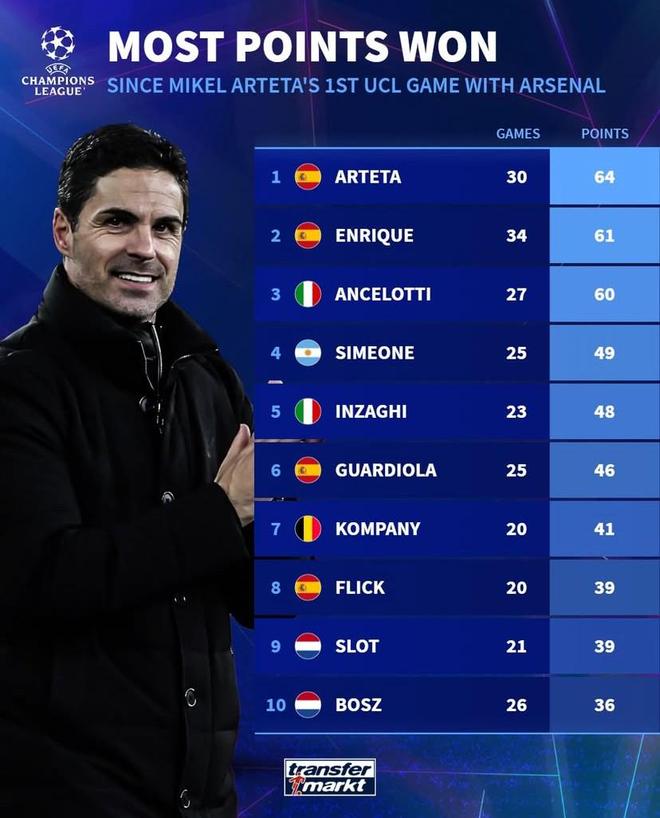 - 英超 | 自执教阿森纳欧冠首秀以来,阿尔特塔欧冠拿分所有主帅第一