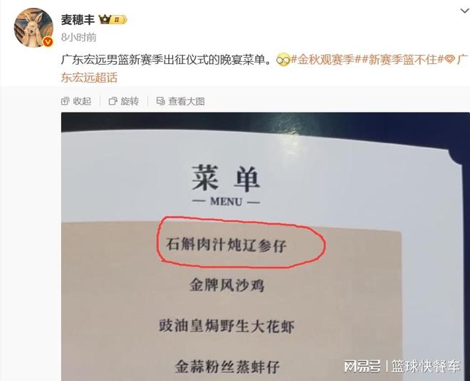 北京时间12月12日,CBA新赛季揭幕战正式打响,作为联盟中的豪门球队,广东队也即将正式开启新赛季。而在新赛季出征仪式上,广东队总经理朱芳雨也是豪言壮语,他直言广东队今夏一系列疯狂举动,为的就是新赛季全力冲击第12冠。不过,在广东队这一次出征晚宴上,他们的第一道菜却非常有趣——石斛肉汁炖辽参仔。看样子,广东队新赛季第一刀还是针对辽宁队。