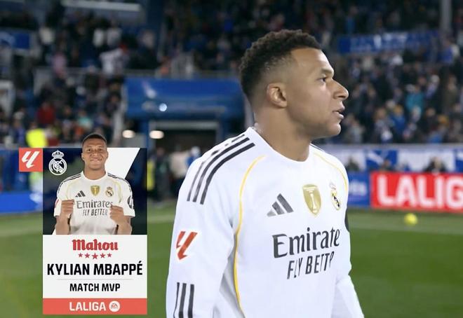 此役客场对阵阿拉维斯,首发出战的姆巴佩在比赛第24分钟左路内切突破后兜射破门,帮助皇家马德里取得1-0领先,最终2-1击败对手。本场比赛打满全场的姆巴佩完成5次射门,2次射正,成功过人3次,均为全场最多。最终经过评选,姆巴佩当选西甲官方全场最佳球员。