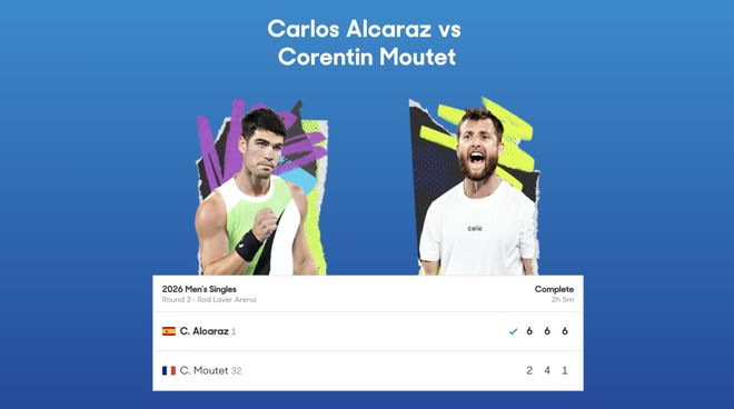 第三盘阿尔卡拉斯更是势不可挡,破掉了对手四个发球局中的三个,6-1再赢一盘,从而以3-0的比分进入澳网16强。下一轮比赛,阿尔卡拉斯将与美国选手保罗争夺八强席位!