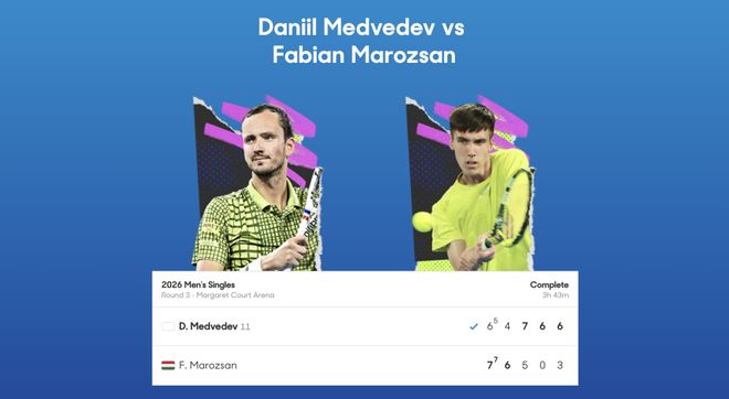 澳网男单第三轮,三届赛会亚军、11号种子梅德韦德夫上演“输二赢三”,以6-7(5)、4-6、7-5、6-0、6-3逆转匈牙利选手毛罗然,成功跻身16强,后者则是连续三年止步32强。